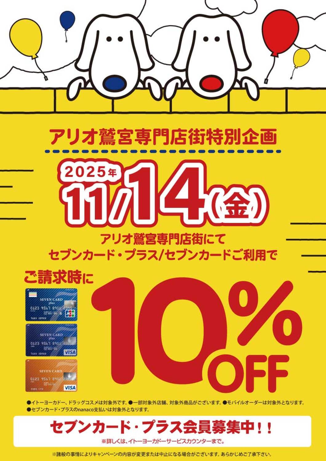 【11/14(金)】アリオ鷲宮専門店会特別企画 セブンカード(プラス)ご請求時に10%OFF