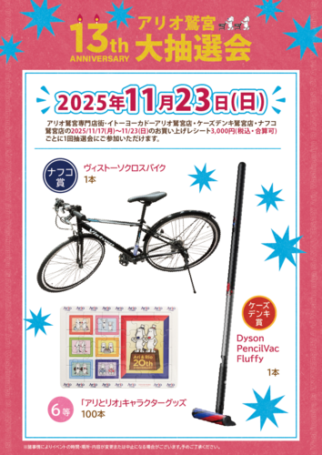 アリオ鷲宮専門店街・イトーヨーカドーアリオ鷲宮店・ケーズデンキ鷲宮店・ナフコ鷲宮店の2025/11/17(月)~11/23(日)のお買い上げレシート3,000円(税込・合算可)