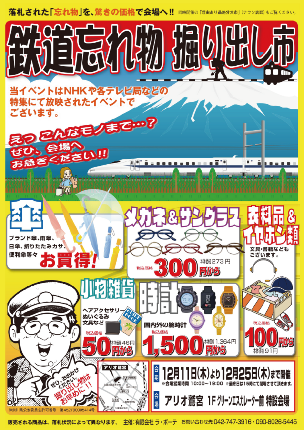 入札などにより落札された電車の中での忘れ物を、クリーニングや消毒、更には修理を施し、お手頃価格、格安にてご提供いたします。