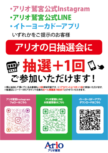 アリオ鷲宮公式LINE又はInstagram又はイトーヨーカドーアプリご提示(新規登録可)で抽選+1回※1グループ様1回限りの特典となります。(複数端末のご提示でもプラス1回のみ)