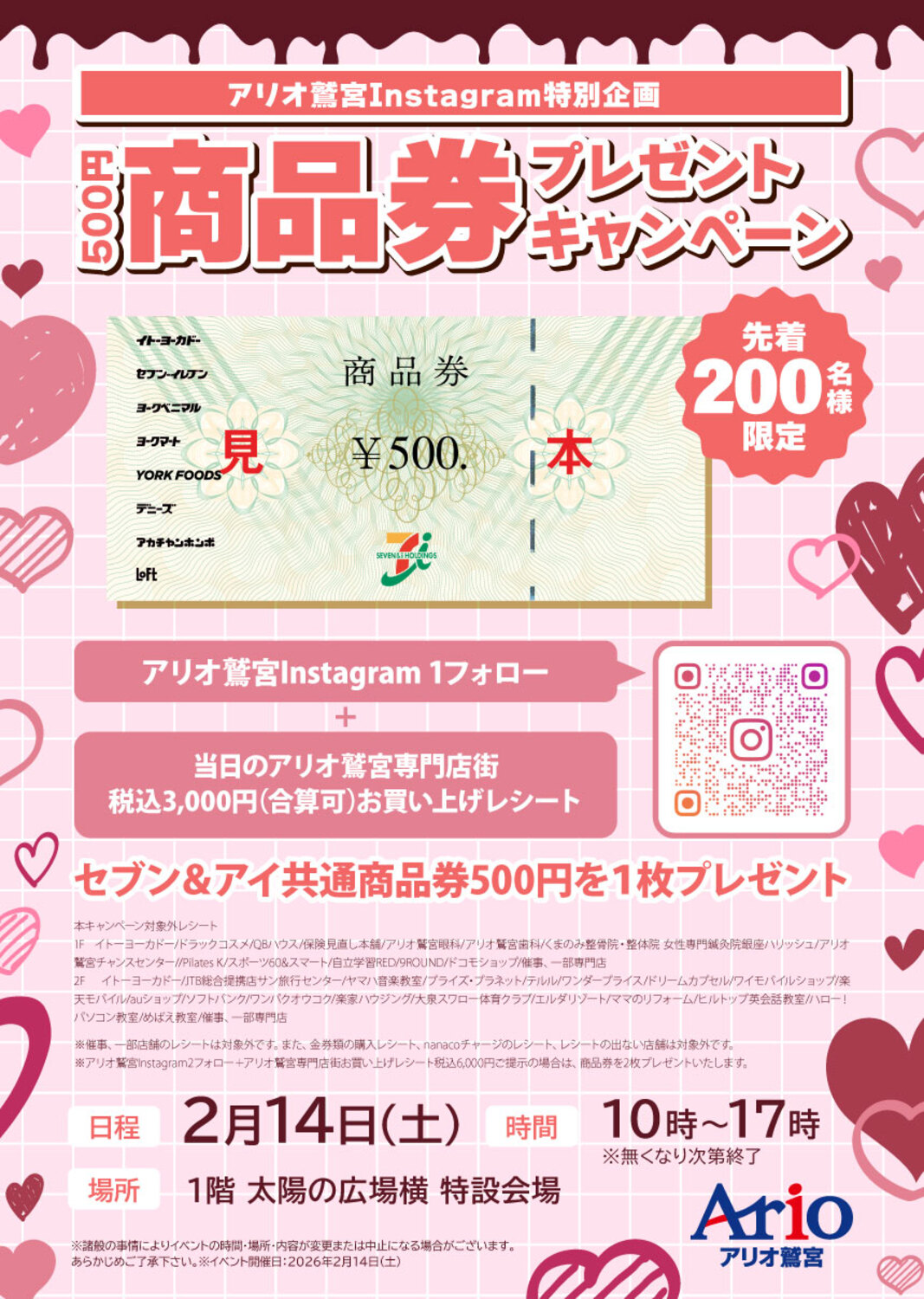 ※アリオ鷲宮Instagram2フォロー+アリオ鷲宮専門店街お買い上げレシート税込6,000円ご提示の場合は、商品券を2枚プレゼントいたします。