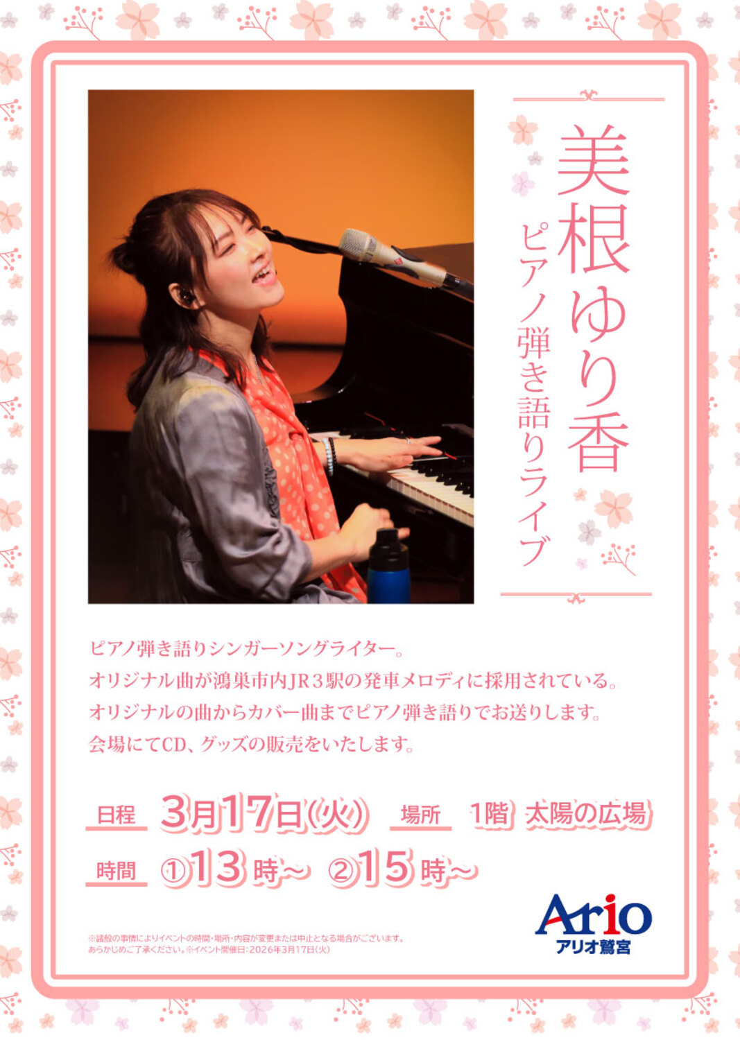 【3/17(火)】美根ゆり香 ピアノ弾き語りライブ
