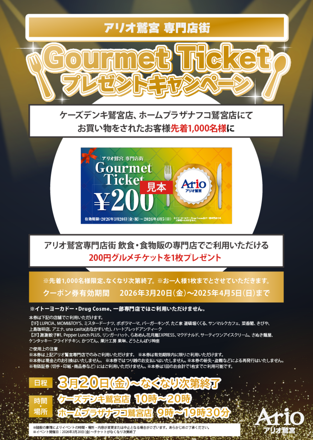 アリオ鷲宮専門店街 飲食・食物販の専門店でご利用いただける200円グルメチケットを1枚プレゼント