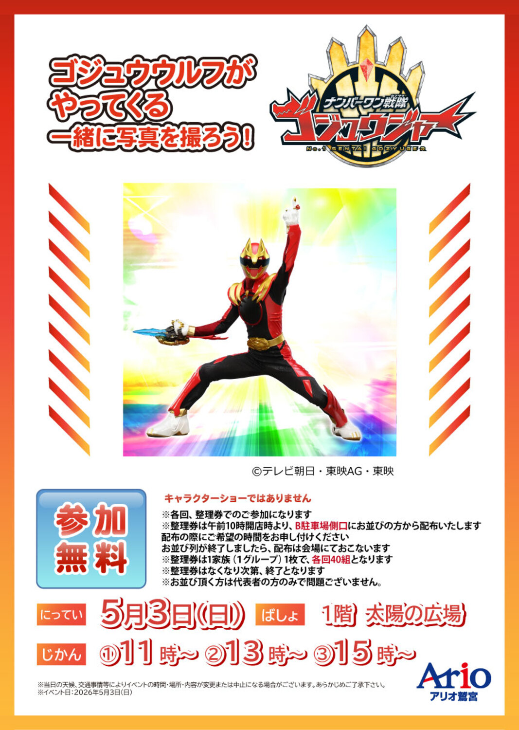 【5/3(日)】ナンバーワン戦隊ゴジュウジャー ゴジュウウルフがやってくる 一緒に写真を撮ろう!