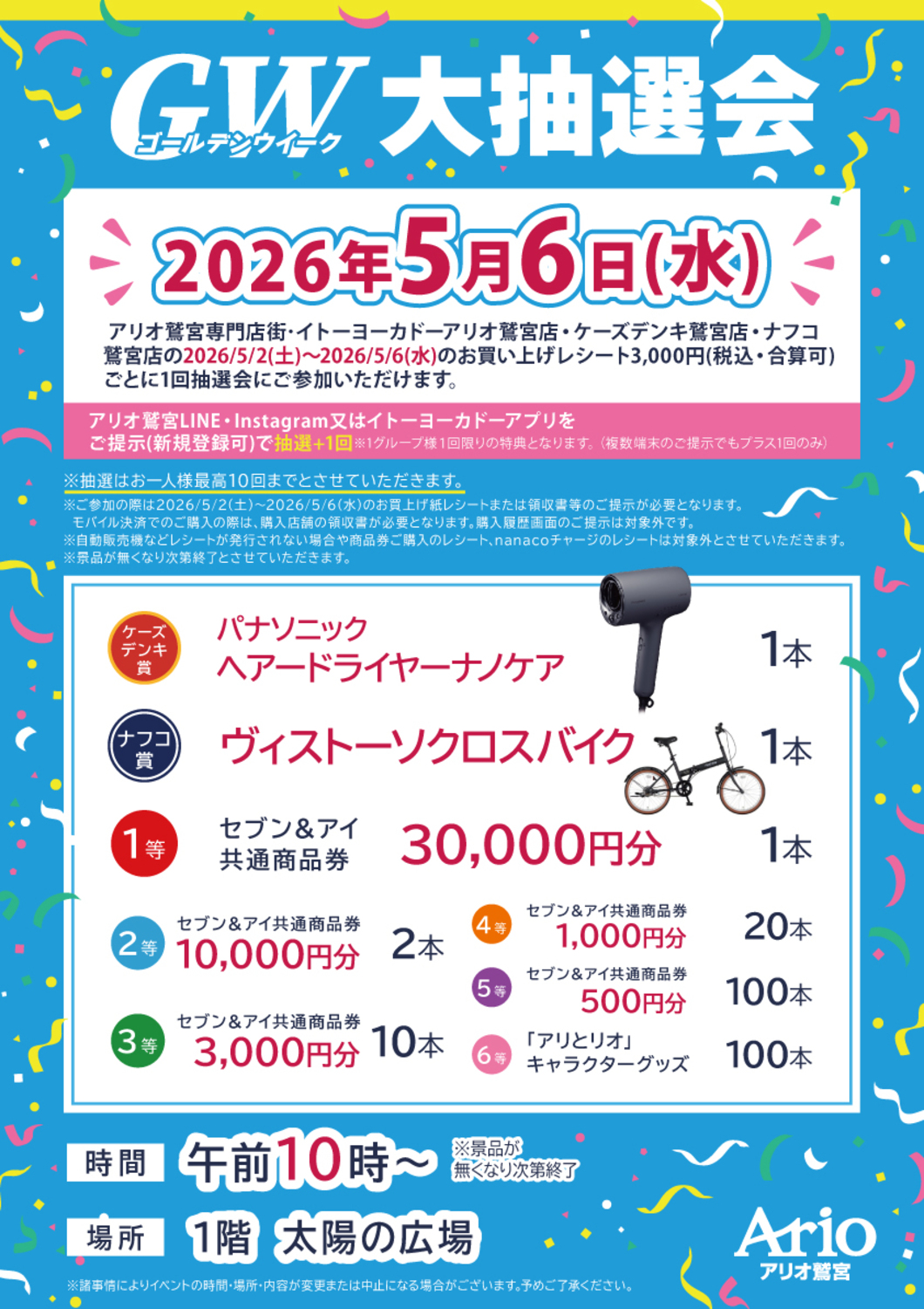 アリオ鷲宮専門店街・イトーヨーカドーアリオ鷲宮店・ケーズデンキ鷲宮店・ナフコ鷲宮店の2026/5/2(土)~2026/5/6(水)のお買い上げレシート3,000円(税込・合算可)ごとに1回抽選会にご参加いただけます。