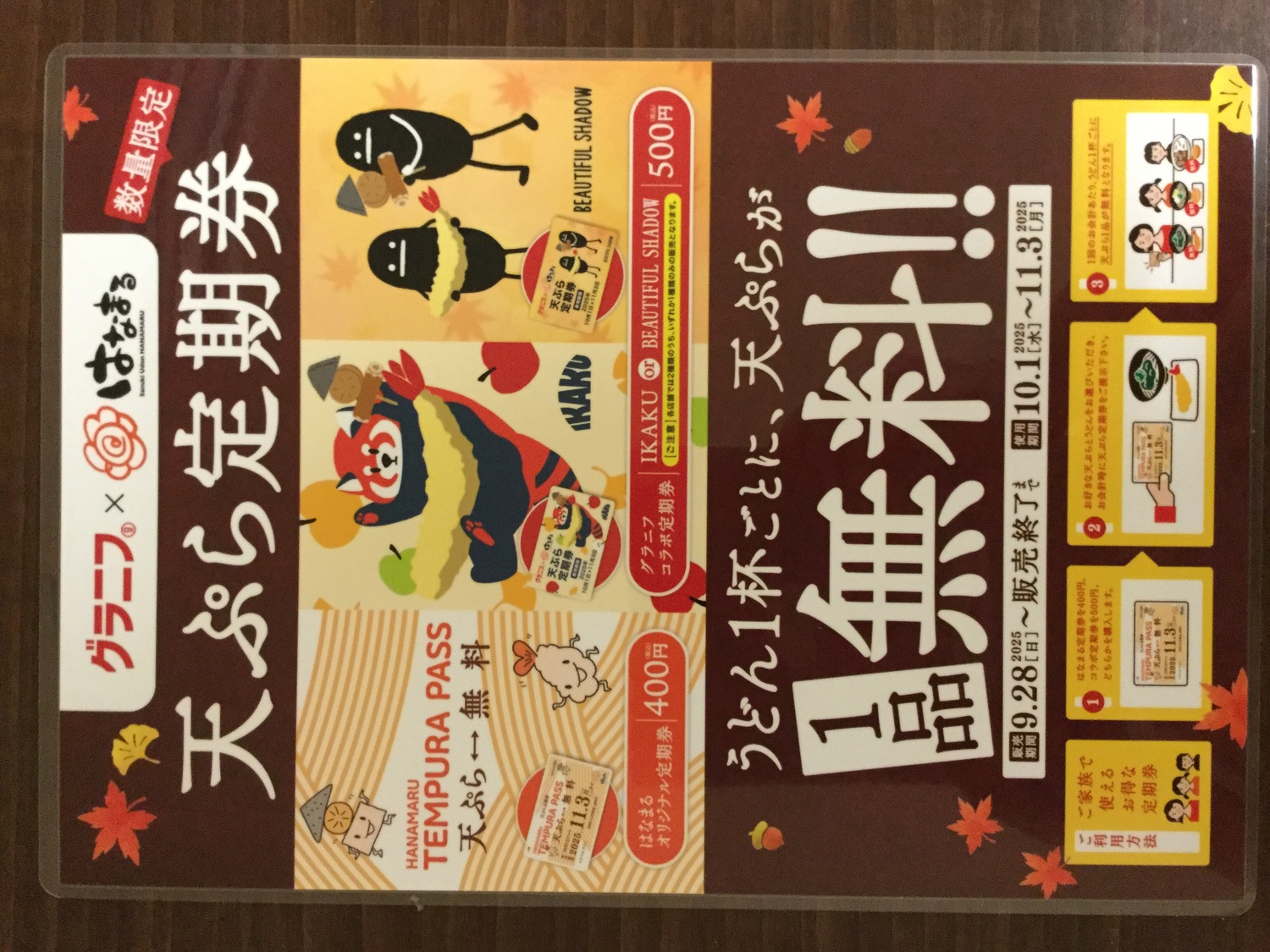 1枚あればうどんの杯数分天ぷらが無料になります。期間中は何度でも使用可能です。