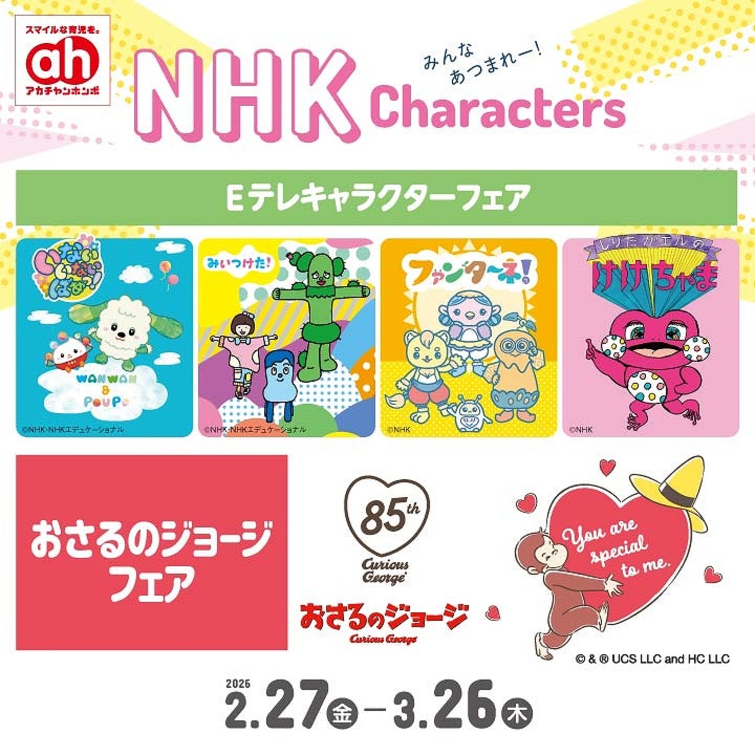 「いないいないばあっ!」「みいつけた!」「ファンターネ!」「しりたガエルのけけちゃま」「おさるのジョージ」など、NHKの人気キャラクターがアカチャンホンポに大集合♪