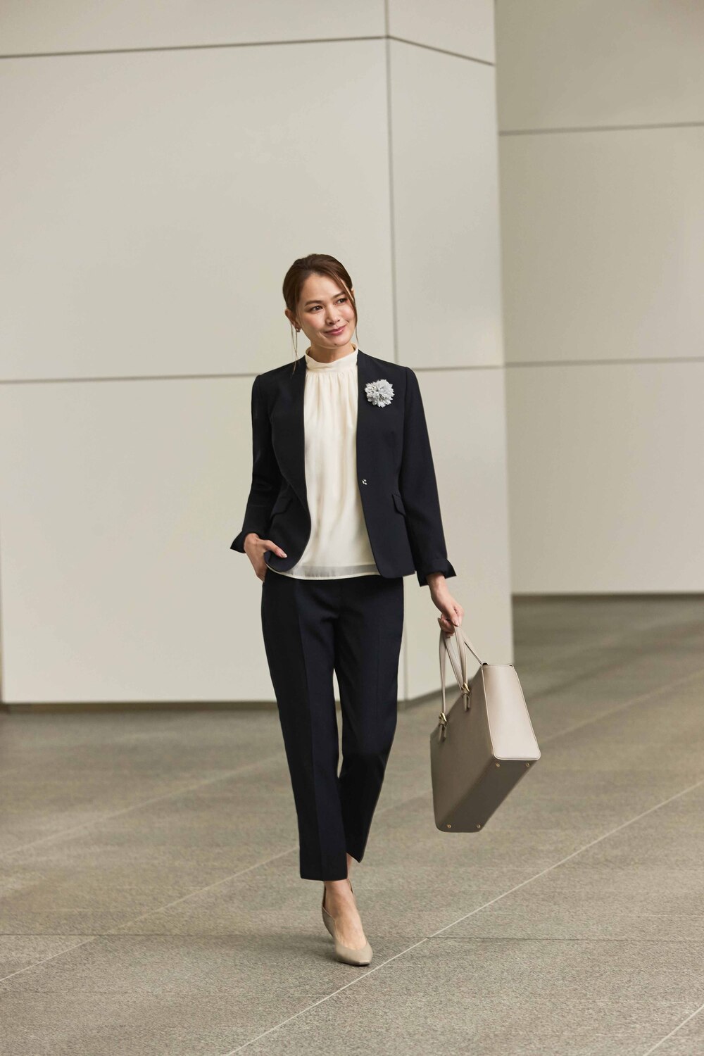 普段の仕事でも使いやすい定番色のノーカラージャケット。