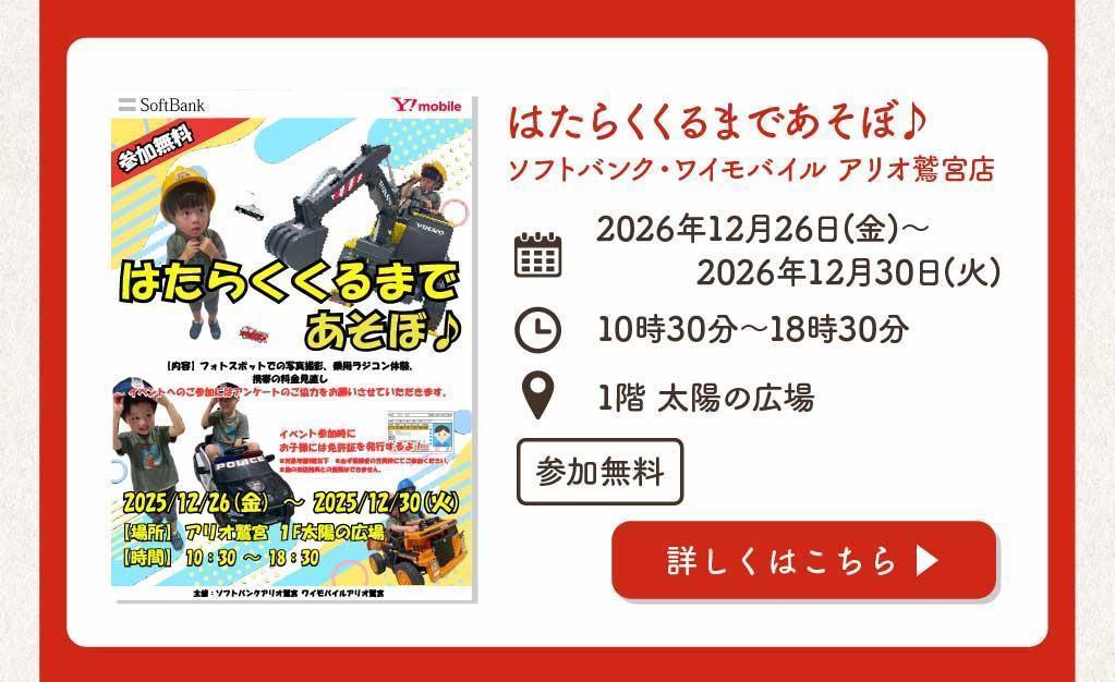 【12/26(金)~12/30(火)】はたらくくるまであそぼ♪ ソフトバンク・ワイモバイル アリオ鷲宮店
